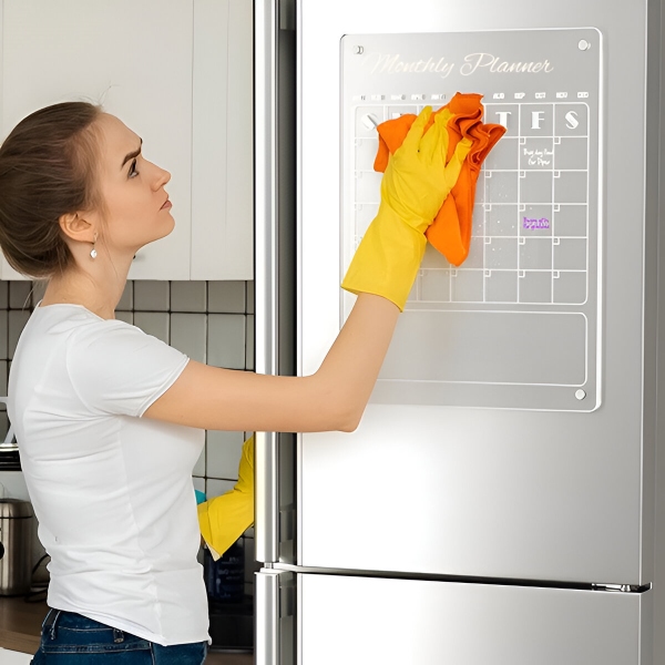 Planificatorul nostru acrilic are o forță magnetică puternică. Dacă trebuie să îl reinstalați, asigurați-vă că urmați procedura corectă de îndepărtare. Evitați să îl trageți direct în jos, deoarece acest lucru ar putea zgâria frigiderul. Fiți atenți și manevrați calendarul cu grijă.