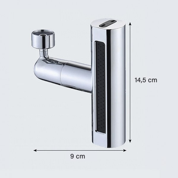 Material: corp din plastic ABS + racord din alamă Dimensiuni: 14,5 x 9 cm Moduri de pulverizare: 3 (jet, flux de bule, ceață) Rotire: 360° Compatibilitate: se potrivește majorității robinetelor standard (vezi manual pentru specificațiile filetului) Timp de instalare: sub 30 de secunde Unelte necesare: niciuna
