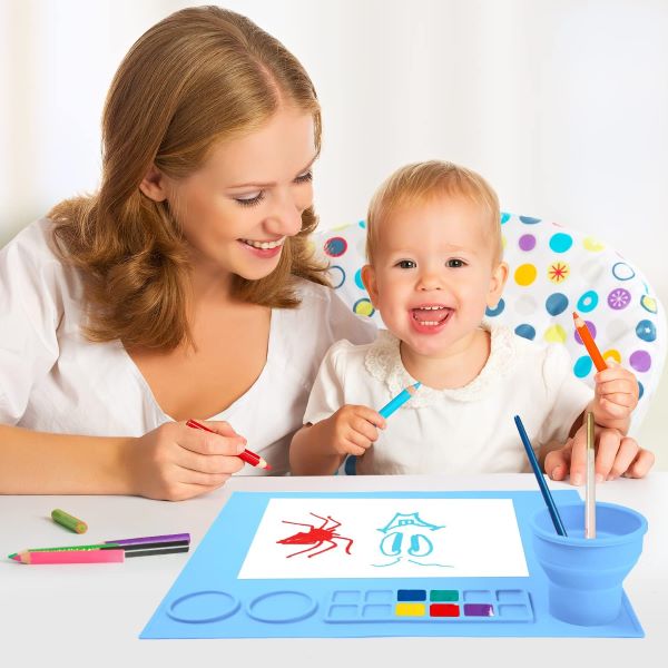 Primul nostru covoraș cu un pahar de curățare a pensulelor încorporat și pliabil. Paharul pentru curățarea pensulelor este conceput pentru a ține apă și a curăța pensulele.