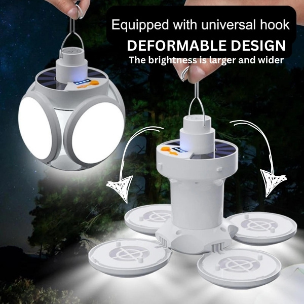 ☀️ Patru nuanțe de lumină pliabile oferă iluminare universală, în timp ce încărcarea solară și USB asigură o luminozitate continuă.