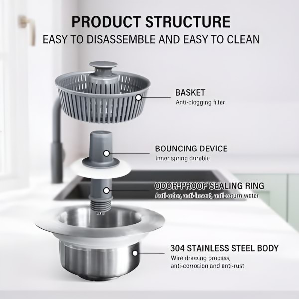 Această soluție completă funcționează ca sită, dop și filtru de mirosuri—menținând chiuveta curată, uscată și fără mirosuri neplăcute.